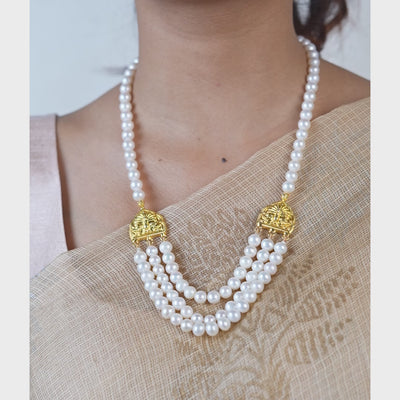 Heritage Aesthetics: A three-line necklace crafted from lustrous freshwater pearls and traditional motifs.