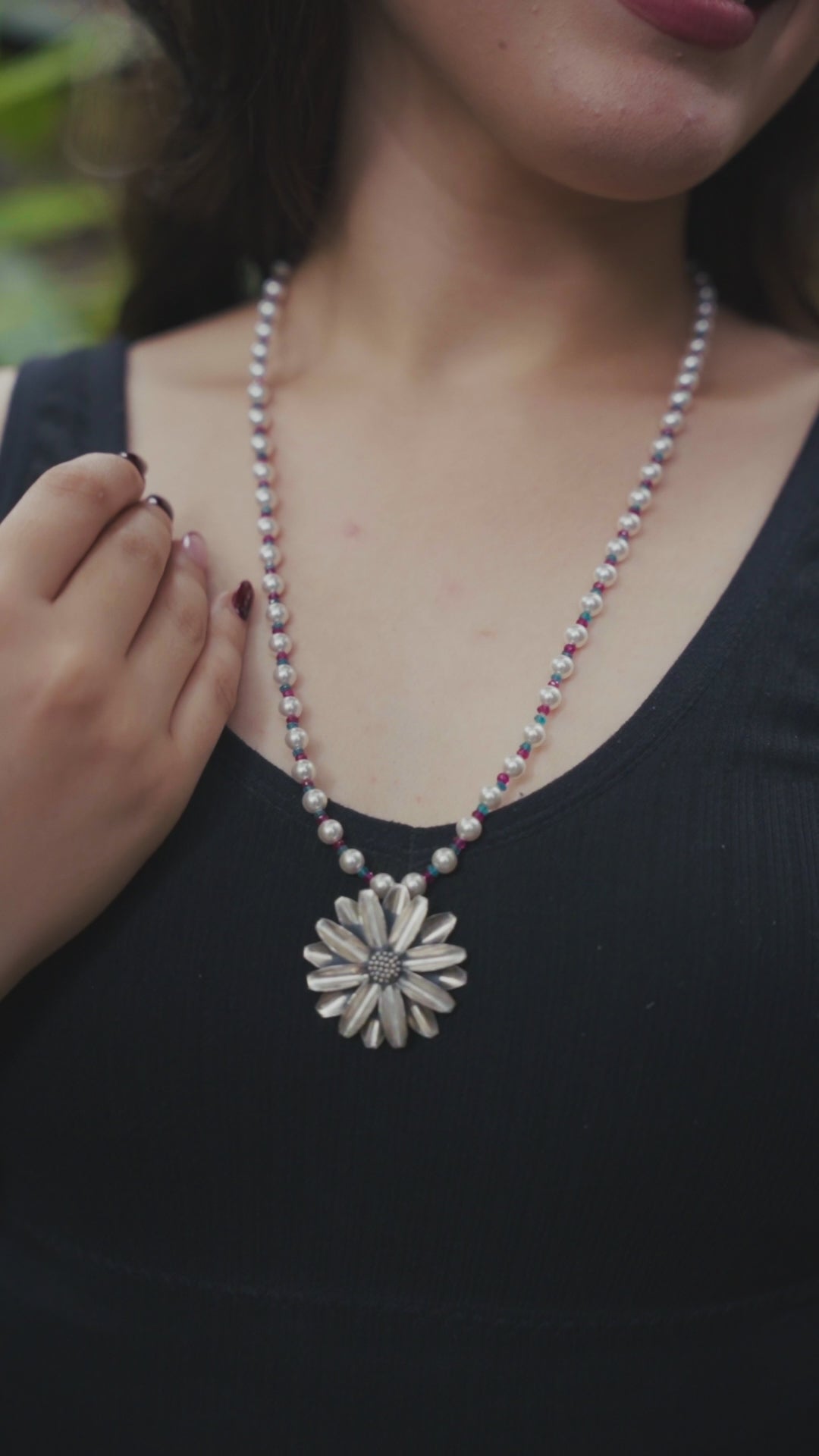 Silver Soorajmukhi Pendant Necklace with Pearls and Semiprecious Stones